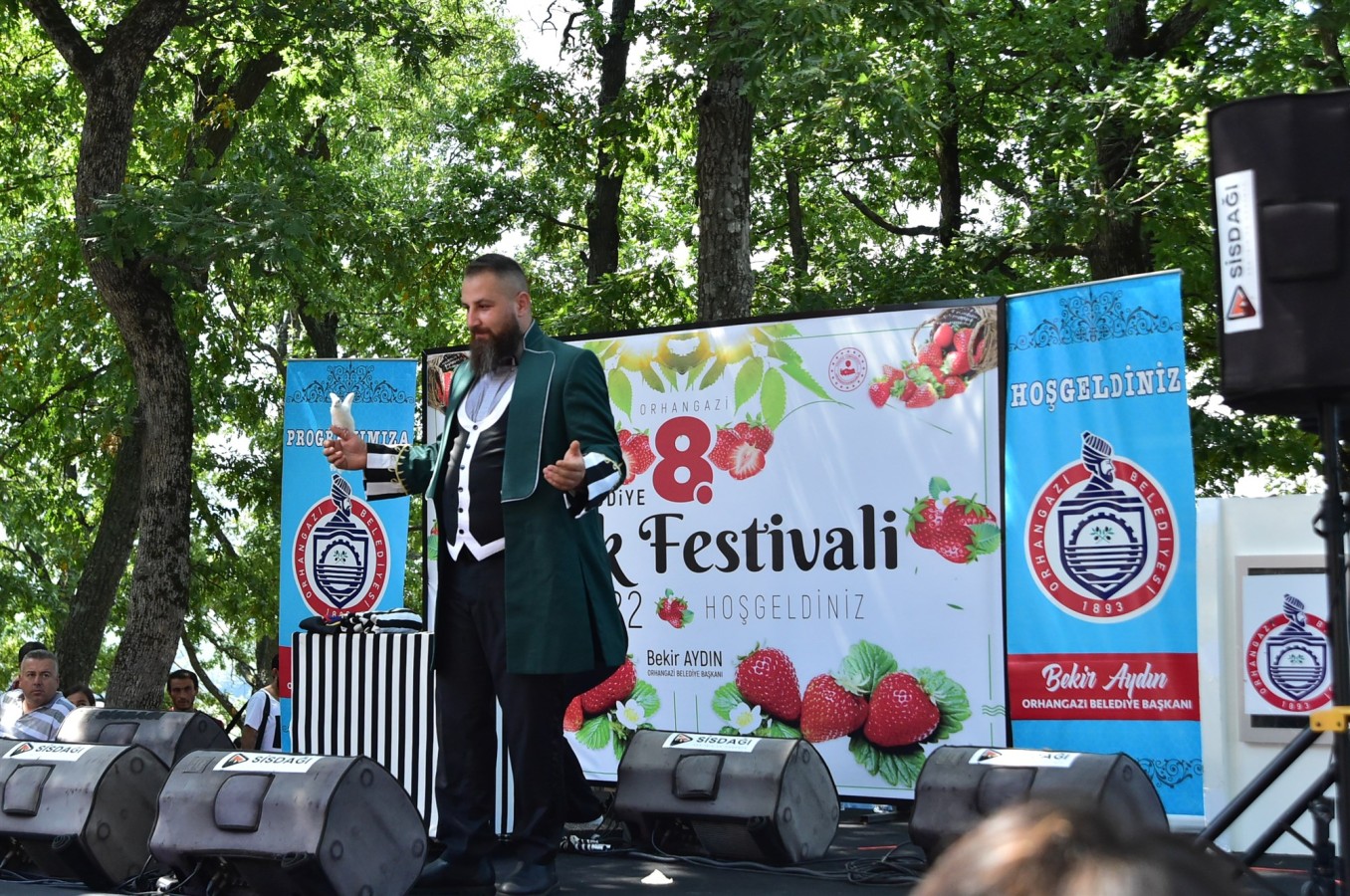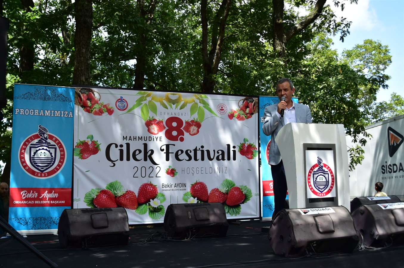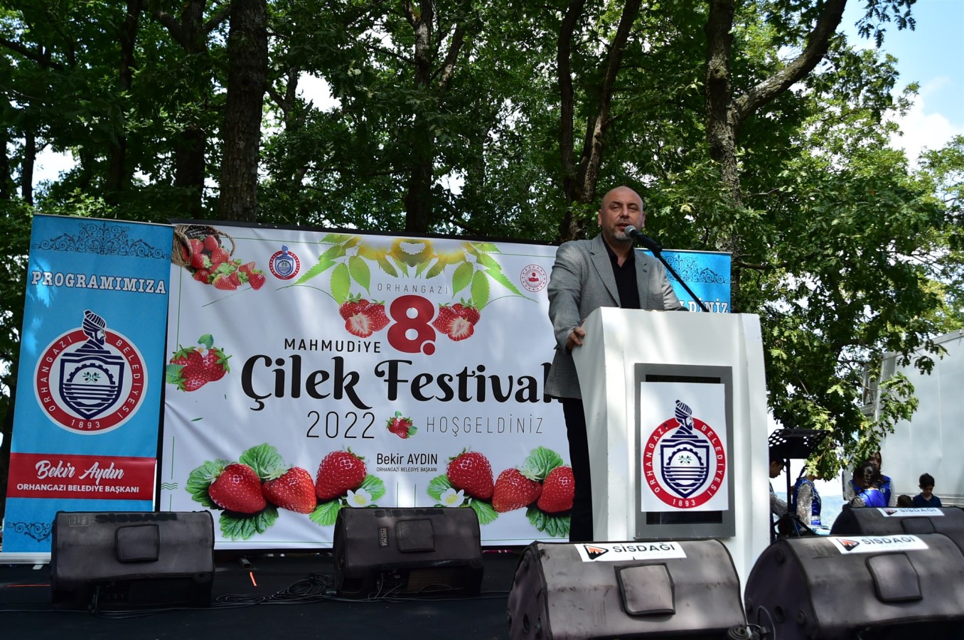 Orhangazi Belediye Başkanı Bekir Aydın festivalde yaptığı konuşmada, Festivallerin sadece bir tanıtım, bir pazarlama metodu olmadığını, Festivallerin Aynı zamanda bir yörenin, bir toplumun kültürü, birlik olma, kaynaşma ve eğlenme vesilesi olduğunu vurguladı. Başkan Aydın sözlerine“8. düzenlenen Mahmudiye Çilek Festivalimizin konusu Mahmudiye çileğinin başarı örneği olan güzel bir hikâyesi vardır. Bu hikâye kamu yöneticilerinin, Muhtarların ve bölge ileri gelenlerinin yaşadıkları beldenin geleceğini nasıl etkileye bildiklerini anlatıyor. Yaklaşık 40 yıl önce ilk çilek fidelerini Mahmudiye Mahallemize getiren zamanın muhtarı Ahmet Demir, yaptığı bu çalışma ile köyüne, köylüsüne güzel bir hizmette bulunmuştur. Bu ürün şimdi de Mahmudiye Mahallesinin büyük bölümünün geçim kapısı olmuştur. Mahmudiye çileği yedi veren fidelerinin ekilmesiyle, artık neredeyse baharın İlk ayında başlayıp, sonbaharın sonuna kadar ürün veren bir geçim kapısı haline geldi. Mahmudiye mahallemizin rakımı, üretimde sera teknolojisinin kullanılması Mahmudiye çileğini daha verimli hale getirdi. Orhangazi’nin yakutu Mahmudiye çileğine bir kardeş geliyor. Yaban Mersin’i ya da daha bilinen adıyla mavi yemiş. Bundan böyle zümrüt taşı gibi yeşil Mahmudiye Mahallemiz, Yakutu kıskandıracak kadar güzel renkli Çileğin yanı sıra firuze taşı gibi görkemli mavi yemişle de süslenecek. Başka söylemle, artık Mahmudiye’ye baktığımızda, kıymetli Bir mücevher, Usta bir ressamın fırçasından çıkmış gibi güzel bir tablo göreceğiz.“ Şeklinde devam etti. Orhangazi Belediye Başkanı Bekir Aydın konuşmasına “ Ben Veysel Üstün muhtarıma da çok teşekkür ediyorum. Nasıl çilek Ahmet Demir muhtarımız zamanında Mahmudiyeye gelmişse, mavi yemişte Veysel muhtarımız zamanında Mahmudiyeyle buluşturulmuştur. Emeği geçen bütün dostlarıma, organizasyonu hazırlayan bütün mesai arkadaşlarıma teşekkür ediyor, sizleri saygıyla sevgiyle selamlıyor, 8. Mahmudiye Çilek Festivali’nin hayırlara vesile olmasını diliyorum.“ Cümleleriyle son verdi.